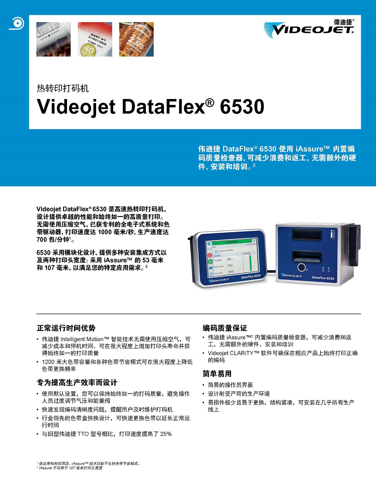 Videojet DataFlex? 6530 是高速熱轉(zhuǎn)印打碼機(jī),設(shè)計(jì)提供卓越的性能和始終如一的高質(zhì)量打印。無(wú)需使用壓縮空氣,已獲專(zhuān)利的全電子式系統(tǒng)和色